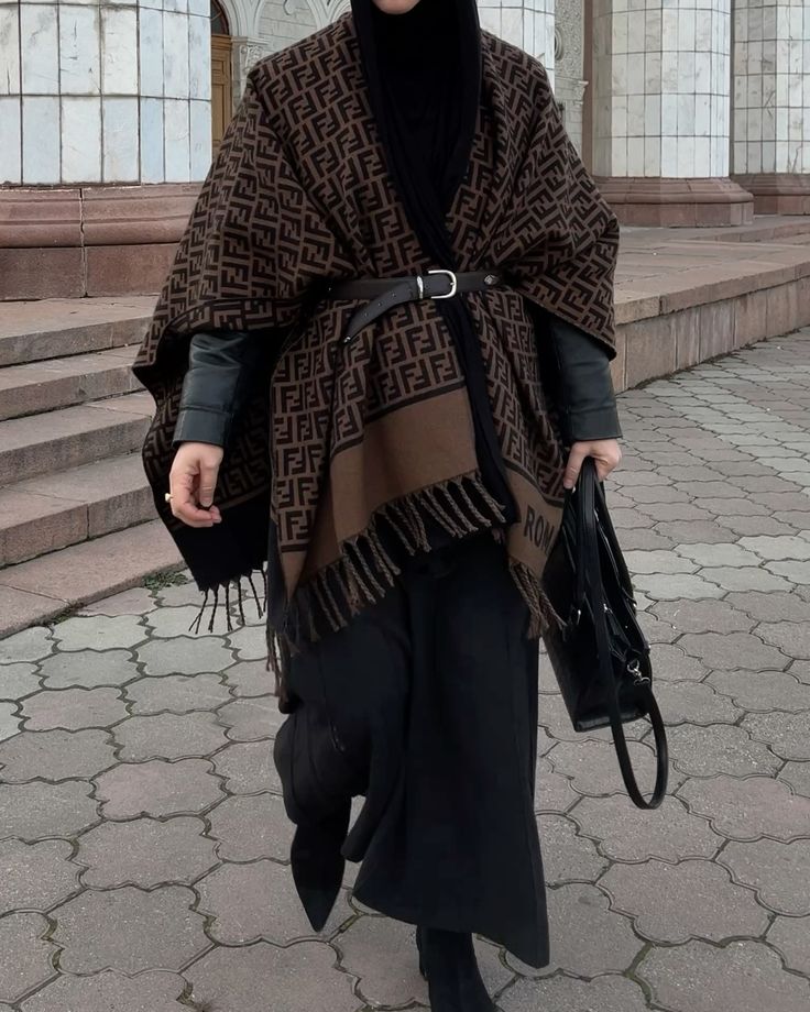 以細腰帶將披肩固定於外層,讓柔軟羊絨與俐落線條形成對比。