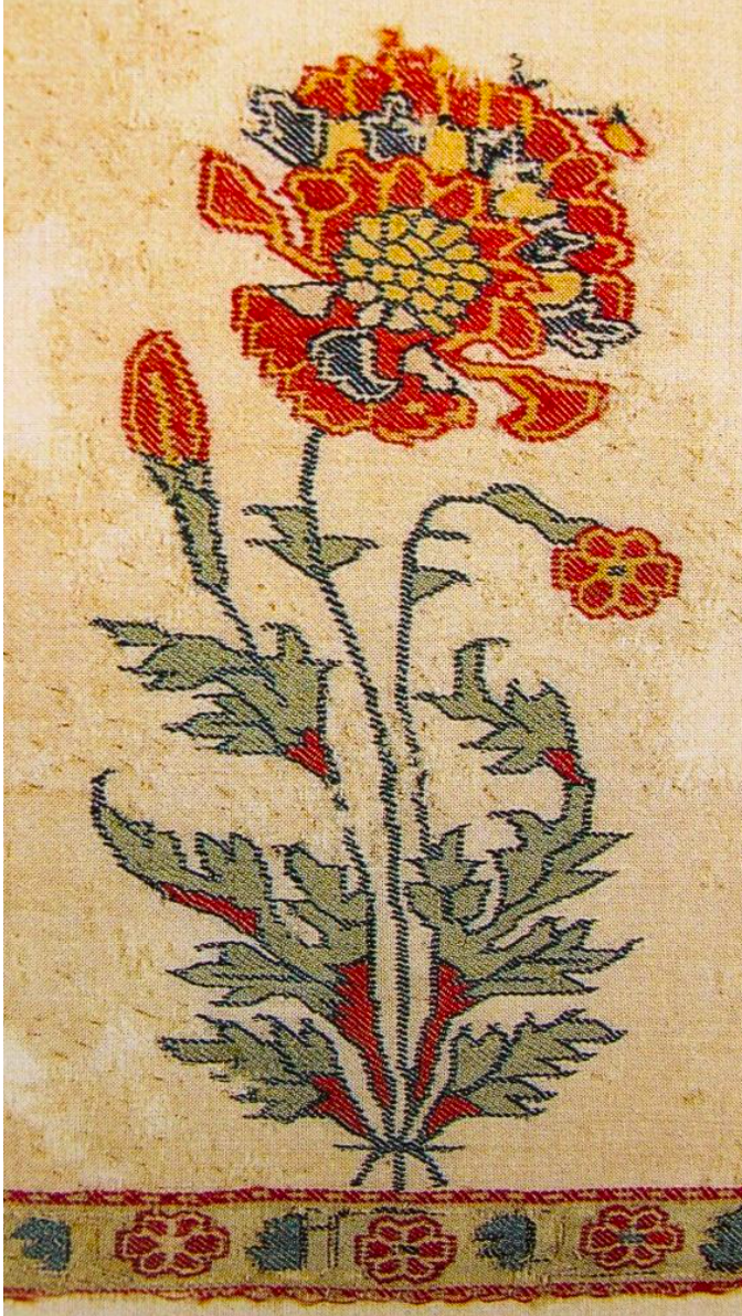 在這一時期,圖騰仍屬於自然花卉與植物枝葉的寫實描繪,尚未出現後來典型的 Buta 水滴輪廓。此設計風格承襲自波斯與莫臥兒文化對自然生命的崇拜,線條纖細、輪廓自由,反映出早期織品裝飾的純粹與原始。